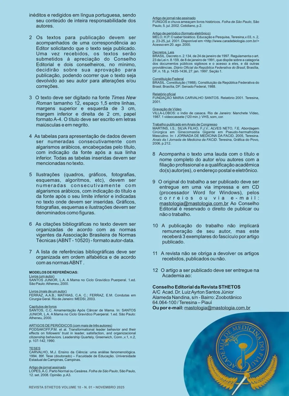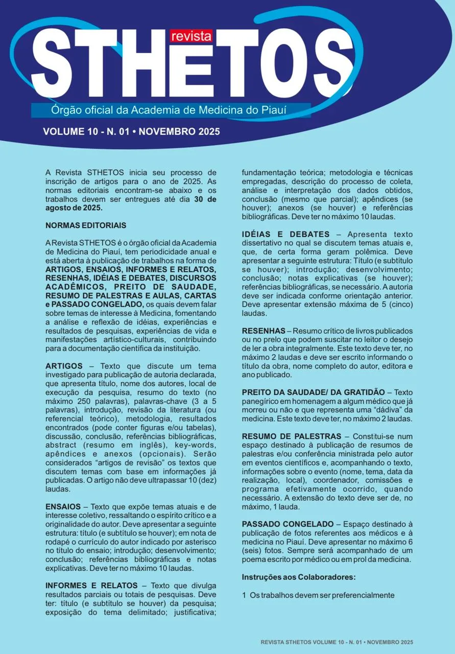 A Revista Sthetos é a publicação oficial da Academia de Medicina do Piauí (AMP), dedicada à divulgação de trabalhos científicos, relatos de experiência, revisões e textos de reflexão na área da saúde. Como órgão oficial da Academia, a revista reforça a missão da AMP de promover a cultura médica, o humanismo, a ética e o conhecimento científico, contribuindo para o desenvolvimento da medicina piauiense e brasileira.